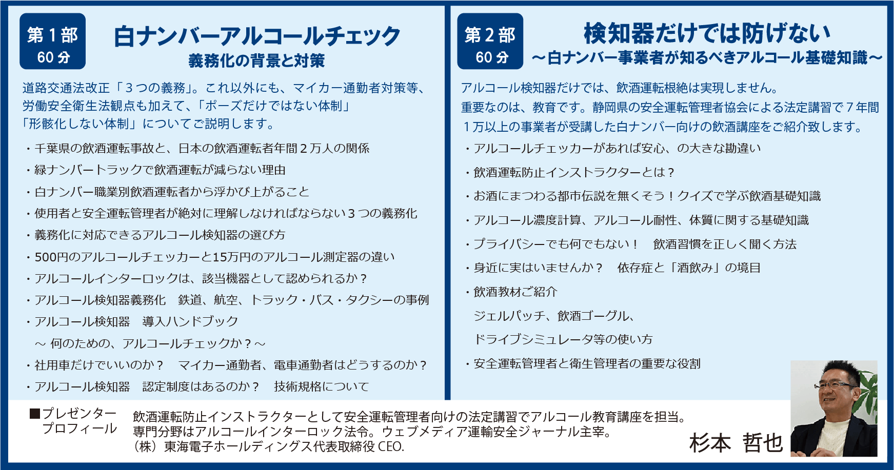 IT点呼システム及びアルコール検知器を開発・販売する東海電子株式会社(本社:静岡県富士市 代表取締役:杉本 哲也)は、 この度、来年4月からの安全運転管理者選任事業所の飲酒検査義務付けの改正にともない、白ナンバ-(社用車)アルコールチェック義務化対象事業者の皆様へ向けての対策セミナー『白ナンバーアルコールチェック義務化対策セミナー』を10月13日(水)、15日(金)に無料オンライン開催をいたします。