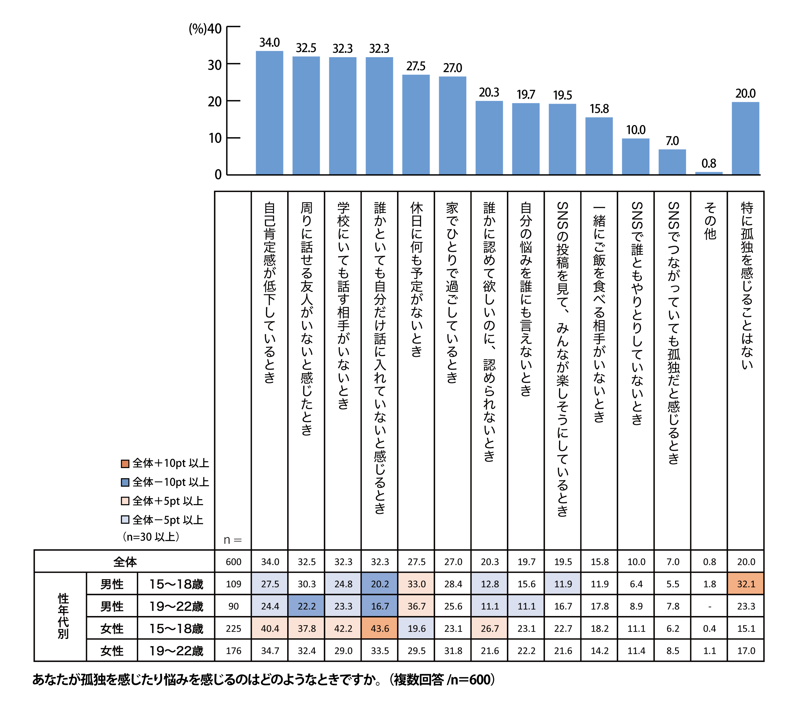最も高いのは「自己肯定感が低下しているとき」で34.0%でした。次いで「周りに話せる友人がいないと感じたとき」が32.5%、「学校にいても話す相手がいないとき」「誰かといても自分だけ話に入れていないと感じるとき」がそれぞれ32.3%と続きました。