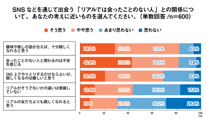「そう思う」と「ややそう思う」を足した「そう思う(計)」の割合では、「趣味や推しの話が合えば、十分親しくなれると思う」が最も高く82.2%でした。次いで「会ったことのない人と関わるのは不安を感じる」が81.7%、「SNS上でやりとりするだけならよいが、親しくなるのは難しいと思う」が68.5%、「リアルかそうでないかの違いは意識していない」が43.5%と続きました。