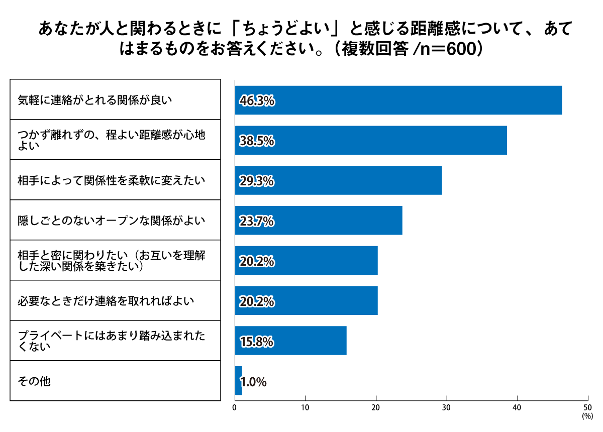 回答率が最も高いのは、「気軽に連絡がとれる関係がよい」で46.3%でした。次いで「つかず離れずの、程よい距離感が心地よい」が38.5%、「相手によって関係性を柔軟に変えたい」が29.3%、「隠しごとのないオープンな関係がよい」が23.7%と続きました。