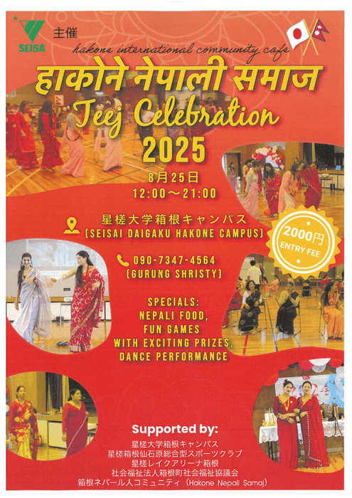 星槎箱根キャンパスでは、これまでも箱根町に暮らす海外国籍の方々の交流場所を提供し、また無料の「にほんごカフェ」を毎週実施して、生活に必要な日本語の修得を支援するなど、共生社会の実現に寄与してきました。また、町内にある公立小学校に通う海外にルーツを持つ子供たちの日本語トレーニングについても協力を行っています。仕事や家族の都合で箱根町に暮らすネパールの方々が、故郷を思い夏にティージ祭を開催したいという思いに答え、昨年に続き今年も本イベントを実施します。