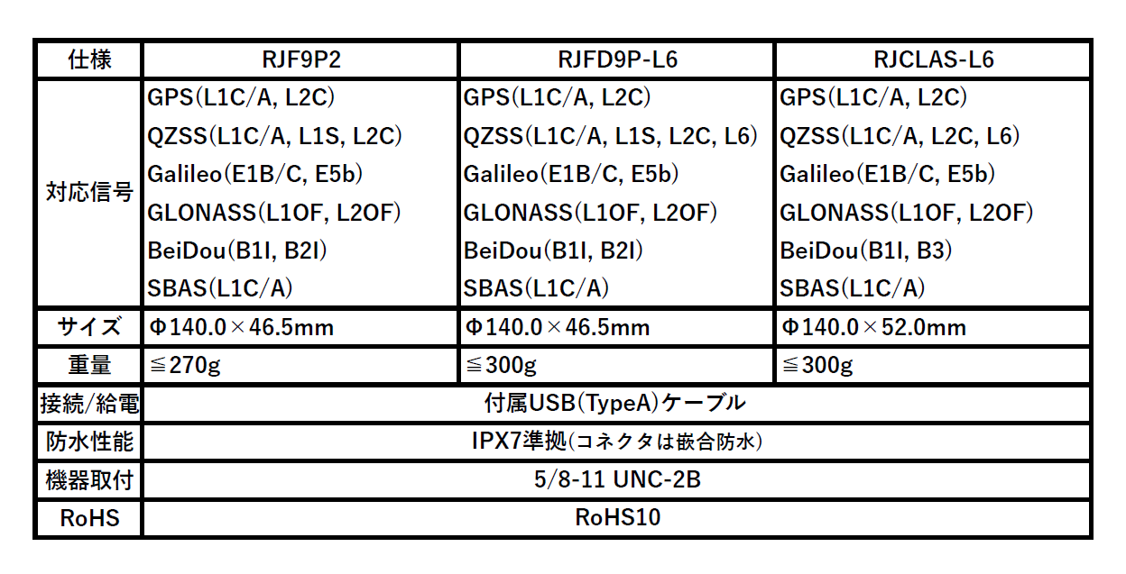 「RJシリーズ」は、受信チップとアンテナ一体型のGNSSユニットで、付属のUSBケーブルでPCに接続し、簡単に各アプリでデータを確認することができるもので、通信状況が悪くRTK測位では厳しい環境下でも、単独測位での高精度な位置測位が期待されます。ラインナップにはL1、L2対応の「RJF9P2」、L6含む3周波対応の「RJFD9P-L6」と「RJCLAS-L6」がございます。