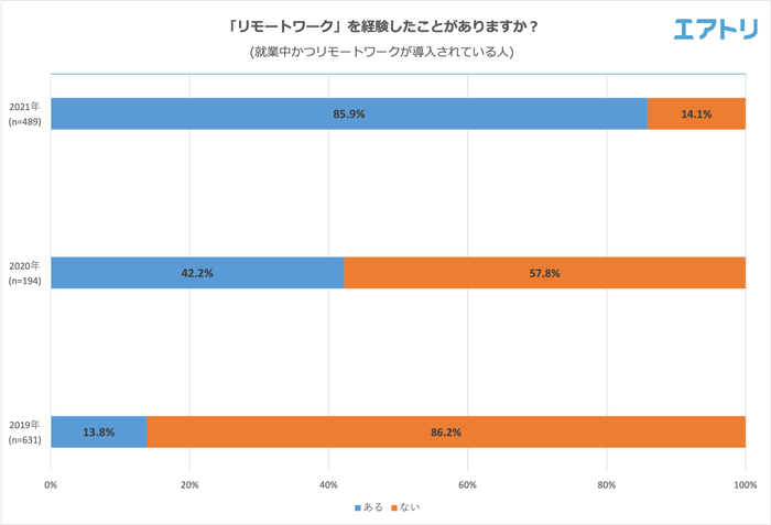 コロナ禍1年目の昨年2020年と比較してもリモートワークを経験したことが「ある」と回答したのは42.2%となり43.7ポイント差となっています。新型コロナウイルス感染拡大の影響を受け2021年は85.9%の人がリモートワークの経験が「ある」という大きな変化がこの3年間で見られました。