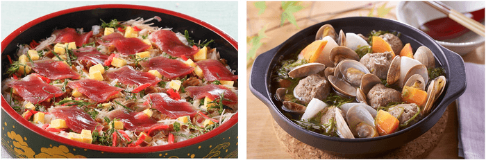 右:うまみたっぷりの出汁を使った鍋仕立てのメニューも伊勢志摩の自慢。この春はいわしのつみれとたっぷりの根菜を使った、肌寒い春先に嬉しい海鮮鍋をご用意しました。香りの良い鳥羽産のめかぶを添えて、その食感も一緒にお楽しみください。