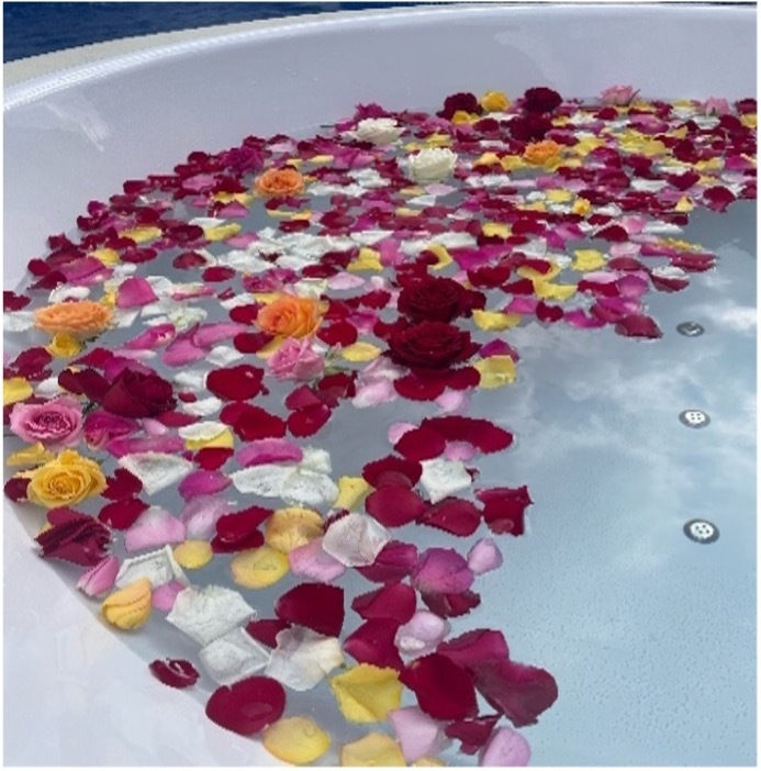 生花のバラの花ビラをプライベートジャグジーに浮べて優雅なひとときをお楽しみいただけます。