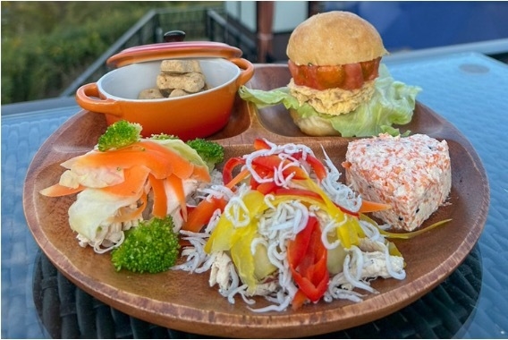 また、宿泊者向けの充実した食事メニューだけでなく、Glamping Resort Awajiではワンちゃん向けにもご当地食事メニューをご用意しております。淡路産揚げしらすや豆腐ハンバーグを中心とした「A“wan”ji 愛犬ディナー」もぜひご利用ください。