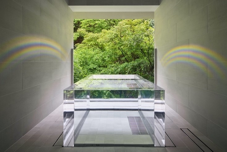 今回は、280年を超える歴史を誇る京都の帯匠「誉田屋」の十代目当主・山口源兵衛により、プラチナの糸で織られた八重菊の文様が入った作品が新たに設置されました。制作にあたっては「菊は湯の友」という発想を起点とし、湯の香りに菊花を添える趣向にまかせて伊藤若冲の「菊花流水図」にインスピレーションを得た作品となっています。