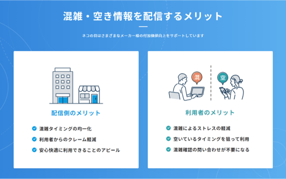 混雑・空き情報配信システム「ネコの目」のサービス内容や、施設の混雑・空き情報を配信するメリットを分かりやすくご紹介しています。