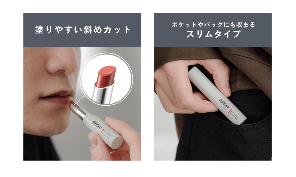 唇にフィットする斜めカットで塗りやすく、初心者でも手軽にケア&メイクが可能。