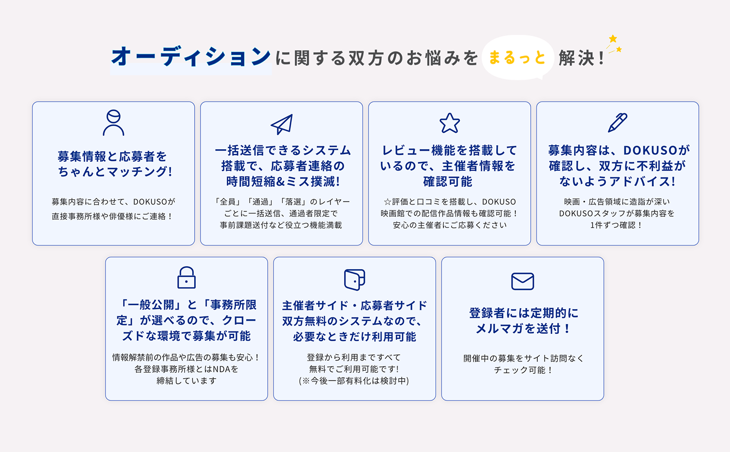 「DOKUSOオーディション」は、2020年1月よりサービスを開始したインディーズ映画に特化した映画見放題サービス「DOKUSO映画館」により培った600人以上の映画監督たちとのつながりを活かし、良質な映画・演劇・MVなどのオーディション情報を掲載するマッチングサービスです。