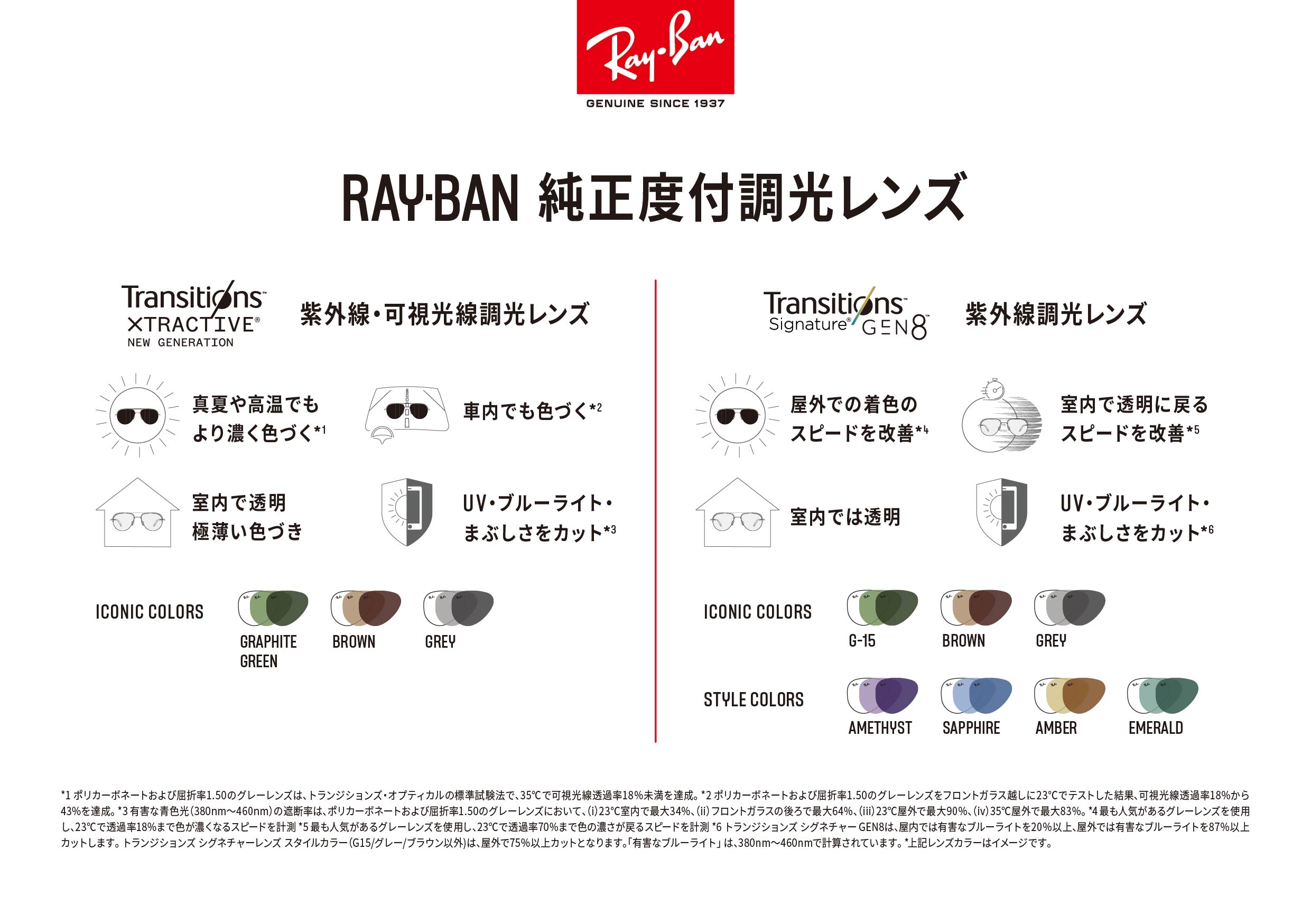 レイバン純正度付レンズでは紫外線量に応じてレンズの⾊が変化するタイプ「トランジションズ シグネチャー® GEN8」と可視光線で色が変わる、運転時等に最適な「トランジションズ® エクストラアクティブ®」の2種に対応。いつでも快適な明るさで光を取り入れることが出来る為、⽬にかかるストレスを軽減し普段使いのメガネとサングラスの1本2役をこなします。