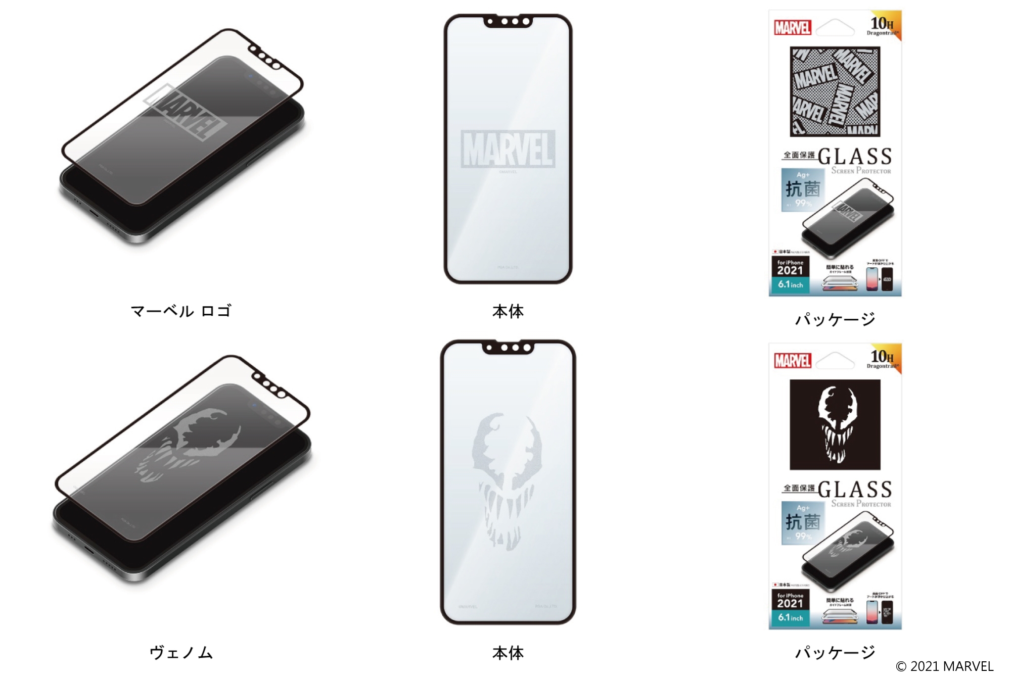 端末の液晶画面をOFFにする事で「MARVEL」デザインが浮かび上がる抗菌液晶全面保護ガラスです。高光沢・光線透過率90%のガラスを採用し、美しい映像や画像をお楽しみ頂けます。銀イオンの力で細菌などの増殖を99%抑制します。また、SIAA(抗菌製品技術協議会)規格準拠商品で高い安全性も特長です。一般的なソーダライムガラスと比べ約6倍の強度を誇る「Dragontrail®」を採用し、耐衝撃性に優れています。表面硬度10Hと耐衝撃加工で液晶画面をキズや衝撃から守ります。また、従来の液晶保護ガラスにある飛散防止加工、ラウンドエッジ加工、撥水・撥油加工など快適性も考慮しました。ガラスの貼り付けに便利なガイドフレーム・ホコリ取りシール・クリーニングクロスの「貼り付けキット」が付属しています。