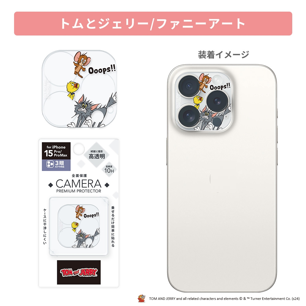 「トムとジェリー」デザインのiPhone 15 Pro/15 Pro Max用カメラフルプロテクターです。