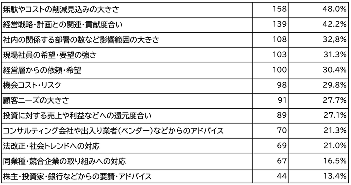 ・DXに取り組むテーマの選定・優先順位づけの方法で、もっとも多い回答は「無駄やコストの削減見込みの大きさ(48.0%)」であった。