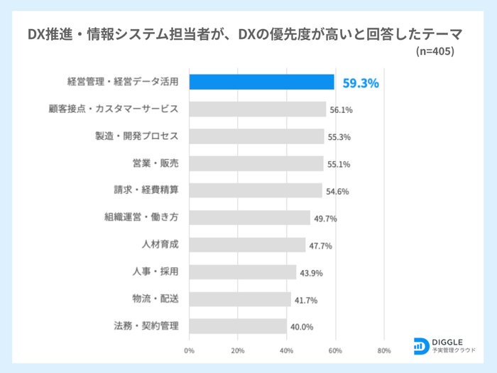 上記10テーマそれぞれに対し、所属企業におけるDXの優先度合いを聞いたところ、「経営管理・経営データ活用」領域については59.3%の担当者が優先度が高い(高いorまあまあ高い)と回答。10テーマの中でもっともDXの優先度が高い結果となった。