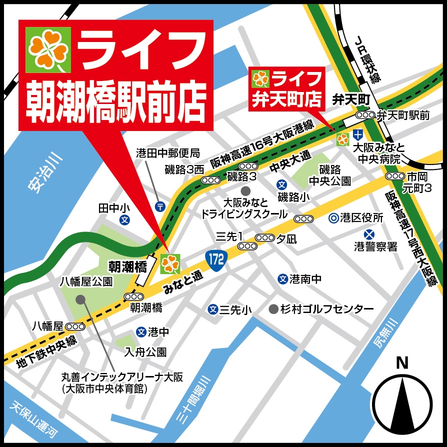 <店 名>「ライフ朝潮橋駅前(あさしおばしえきまえ)店」