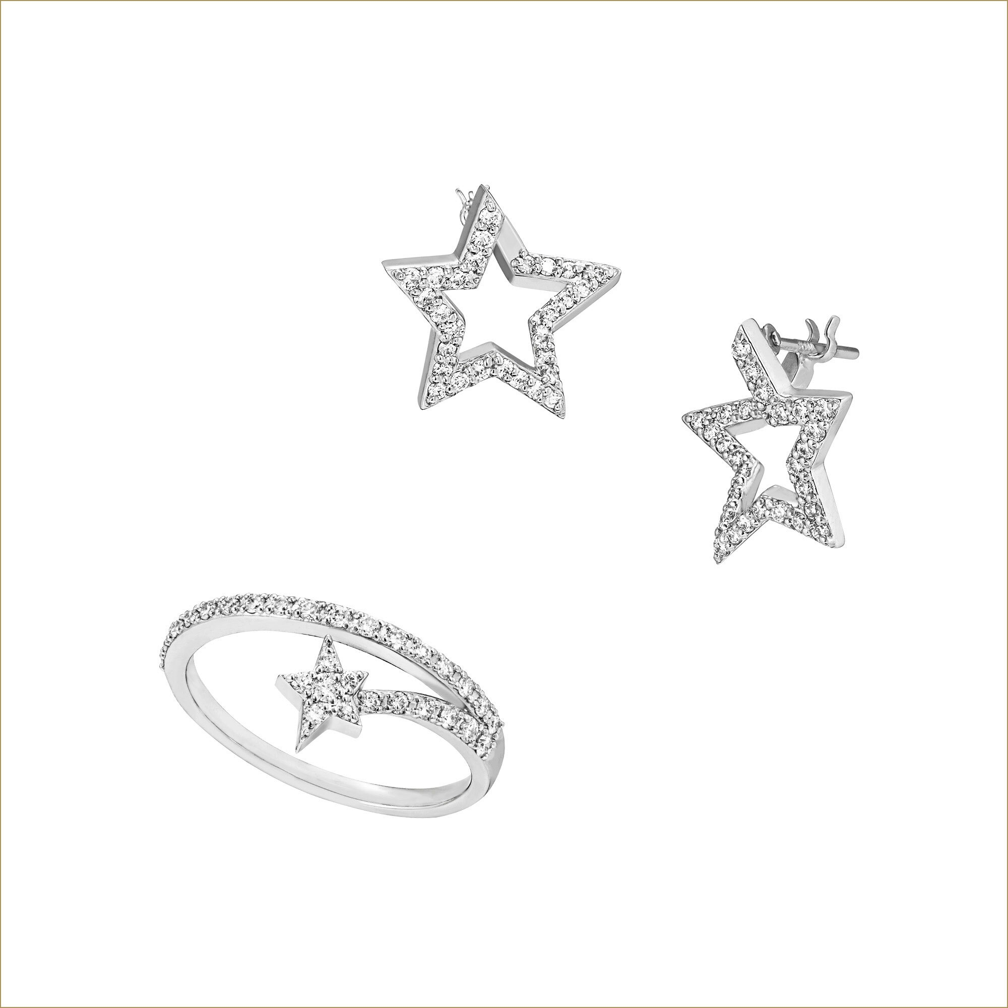 プラチナとダイヤモンドでアシンメトリーの星モチーフを描いたジュエリー。
