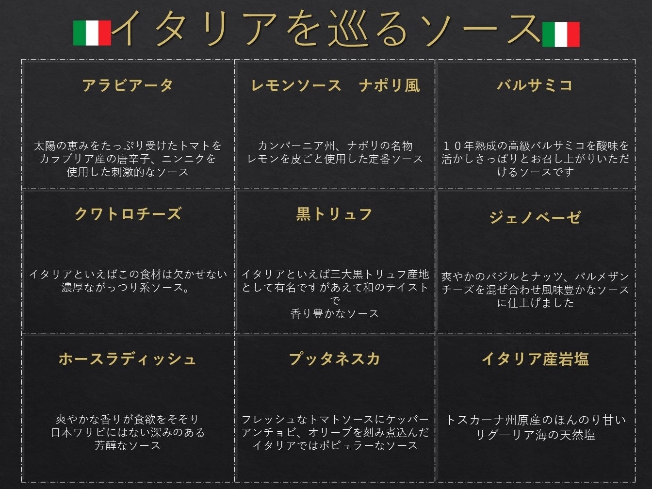 アラビアータ、レモンソース ナポリ風、バルサミコ、クワトロチーズ、黒トリュフ、ジェノベーゼ、ホースラディッシュ、プッタネスカ、イタリア産岩塩