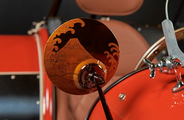 漆本来の溜色と金箔を活かした白檀塗(びゃくだんぬり)を応用し、メンテナンスを前提とした装飾を施しました。 溜塗は経年と共に透明感が増し、絵柄や金属の肌がより美しく琥珀色に輝きます。