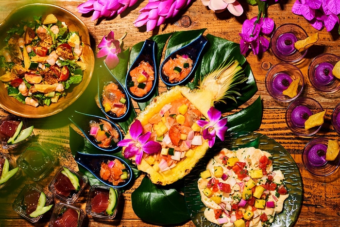 牛肉やチキンのグリルの他、ハワイアン料理の代表的メニュー“ガーリックシュリンプ”、ハワイ風天ぷらは、店内にあるライブコーナーで出来たてをご提供いたします。そのまま食べても、フルーティーなパイナップルBBQソース、ピリ辛がくせになるチャンキーサルサ、ライムの香りが爽やかなシラントロソースなどお好みでどうぞ。
