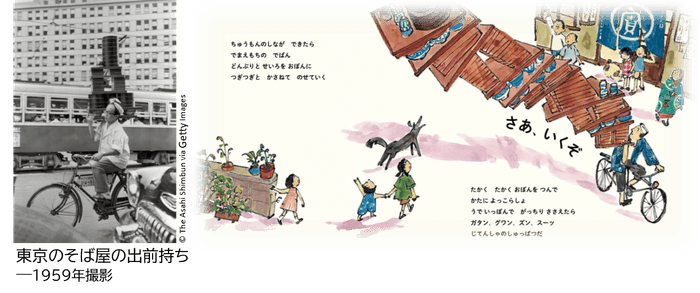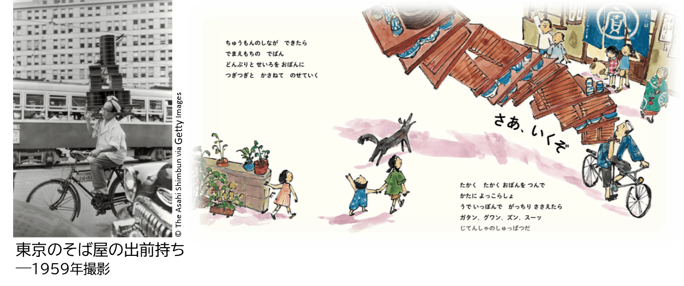 東京の自転車配達人、通称「出前」の姿と、彼らを見つめる子どもたちを描いた絵本です。湯気の立つ熱々の麺を乗せた大きなトレーを高々と重ねて肩に担ぎ、混雑した街中を颯爽と走る姿を通して、働く人の誇りや家族のぬくもり、そして街に生きる人々の息づかいがあふれています。当時の街の様子を味わえる1冊。糸井重里さん推薦。