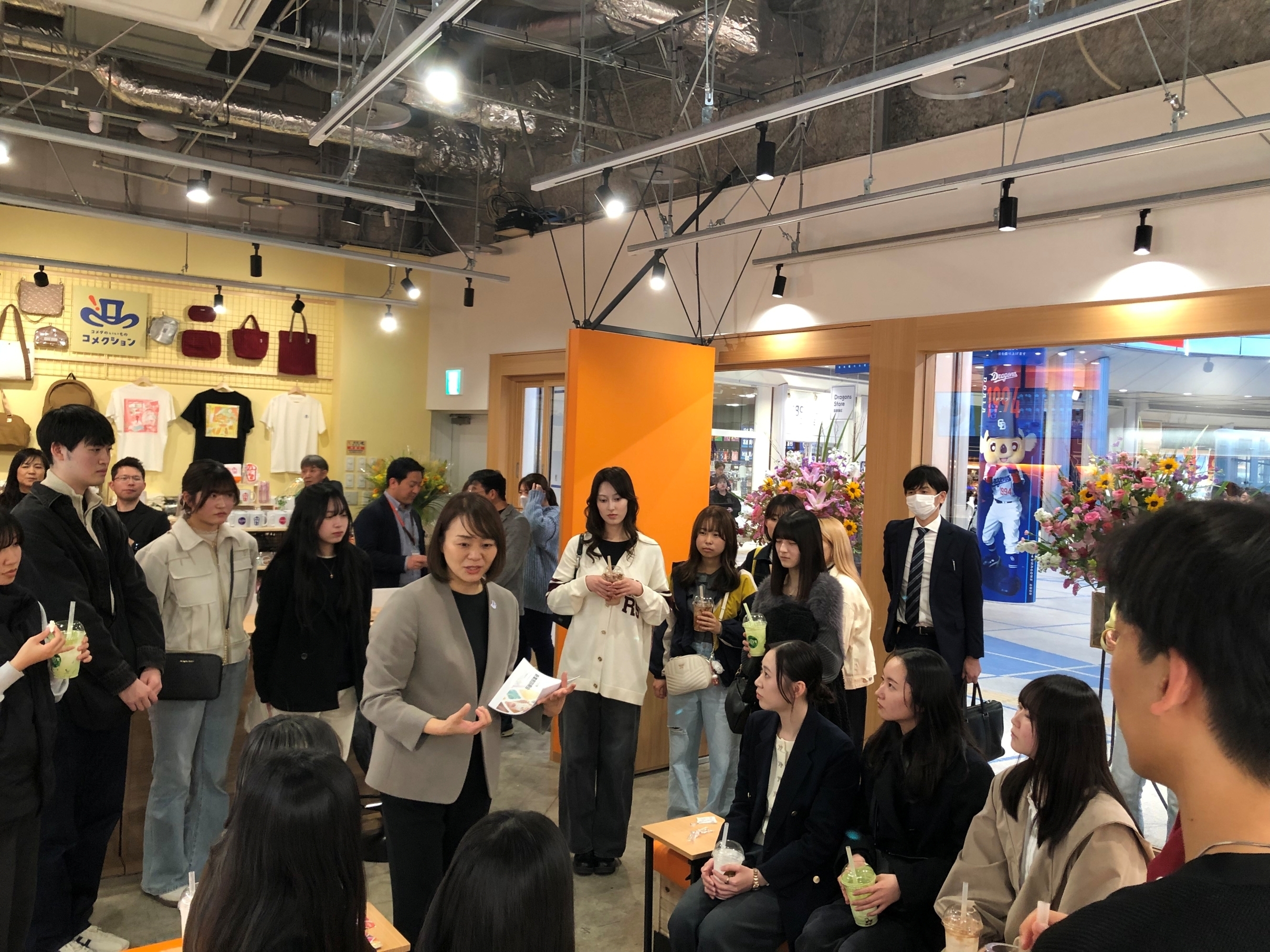 イベント開催の背景にあるのは、名城大学経営学部 山岡 隆志教授(専門:マーケティング、消費者行動論)のゼミナールとの産学連携の取組です。新業態として2025年4月に国内初出店した「ジェリコ堂」。栄オアシス21店は名古屋市栄という立地です。メイン顧客層と想定した10代~20代と同世代のゼミ生たちに、一連のマーケティング・プロセスに基づき、コミュニケーション戦略を提案いただく取り組みを4月~6月にかけて実施しました。2年生から4年生までのゼミ生が「短期マーケティング施策」「長期マーケティング施策」を企画し、資料化。コメダからの2度のフィードバックを経て、書類審査で通過した学生がコメダにプレゼンテーションする報告会を6月に開催しました。当日は、短期施策の上位6名と、中長期施策の上位4名が発表を行いました。