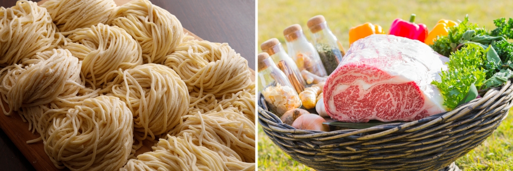 スープとの相性を考え極細麺と平打ち麺の2種類の麺を使用。厳選した風味豊かな国産の小麦をブレンドし天然かん水と塩を使用することで麺のこしと、小麦の香りを感じていただけます。旨味の強い牛骨スープに麺が負けないように加水量、圧延にこだわった特製麺です。