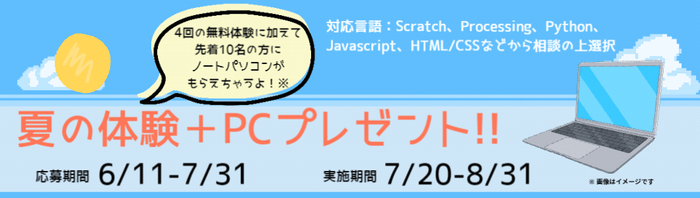プログラミングスクールTENTOでは「夏のキャンペーン+パソコンプレゼント」で通常の授業に4回参加できるキャンペーンを開始いたします。 入会された方に、モバイルノートパソコンをプレゼントいたします。
