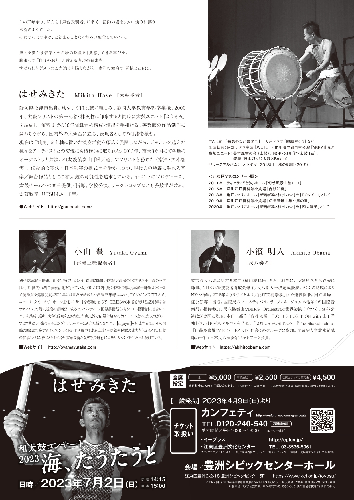 和太鼓の独奏に加え、同年代の名手であり国内外でクリエイティブな活動を展開している小濱明人(尺八)/小山豊(津軽三味線)をゲストに迎え、日本の風土の中で生まれ培われながら今なお進化の途上にある「にっぽんの音と芸」を、豊洲シビックセンターホール独特の劇場空間の中に紡ぎ出します。