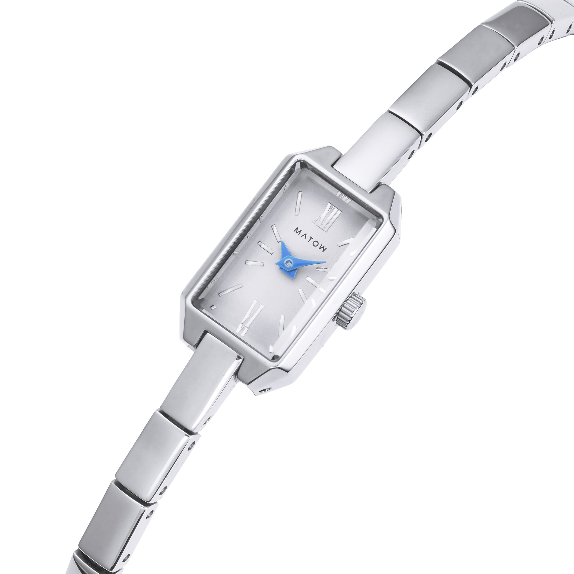 MATOWは、そんな月の持つ神秘性と品格を、腕時計という形で表現しました。デザインインスピレーションは、日本の伝統的な「月を愛でる文化」。満月の煌びやかさだけでなく、新月や三日月の控えめな美しさにも心を寄せる感性を大切にしています。清月/ミニスクエア」は、そんな静かに輝く月の情景を時計のフォルムやディテールに落とし込みました。細身のスクエアケースは、夜空に浮かぶ月のように洗練され、無駄のないシルエット。手首にすっと馴染むコンパクトなサイズ感は、華奢でありながら確かな存在感を演出します。