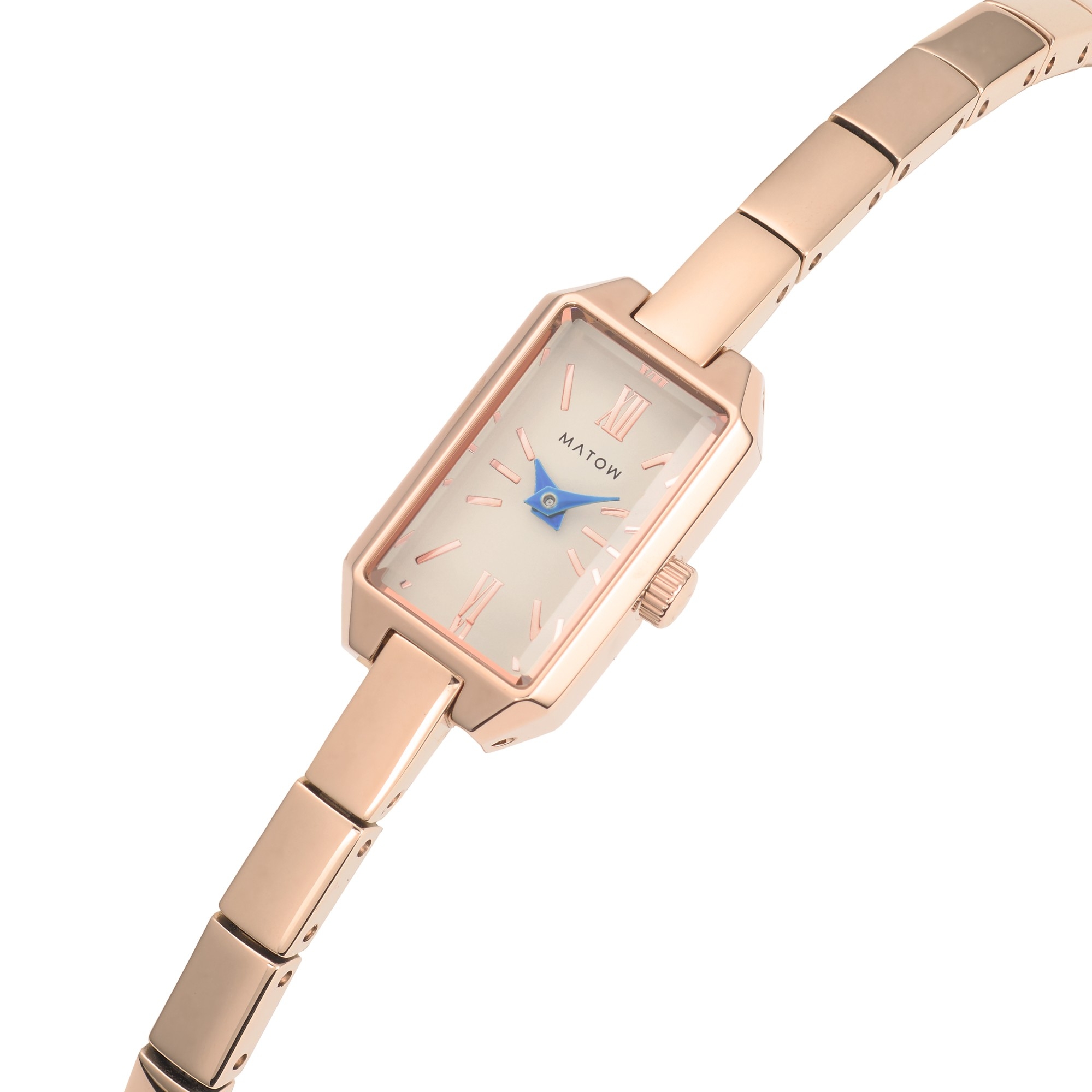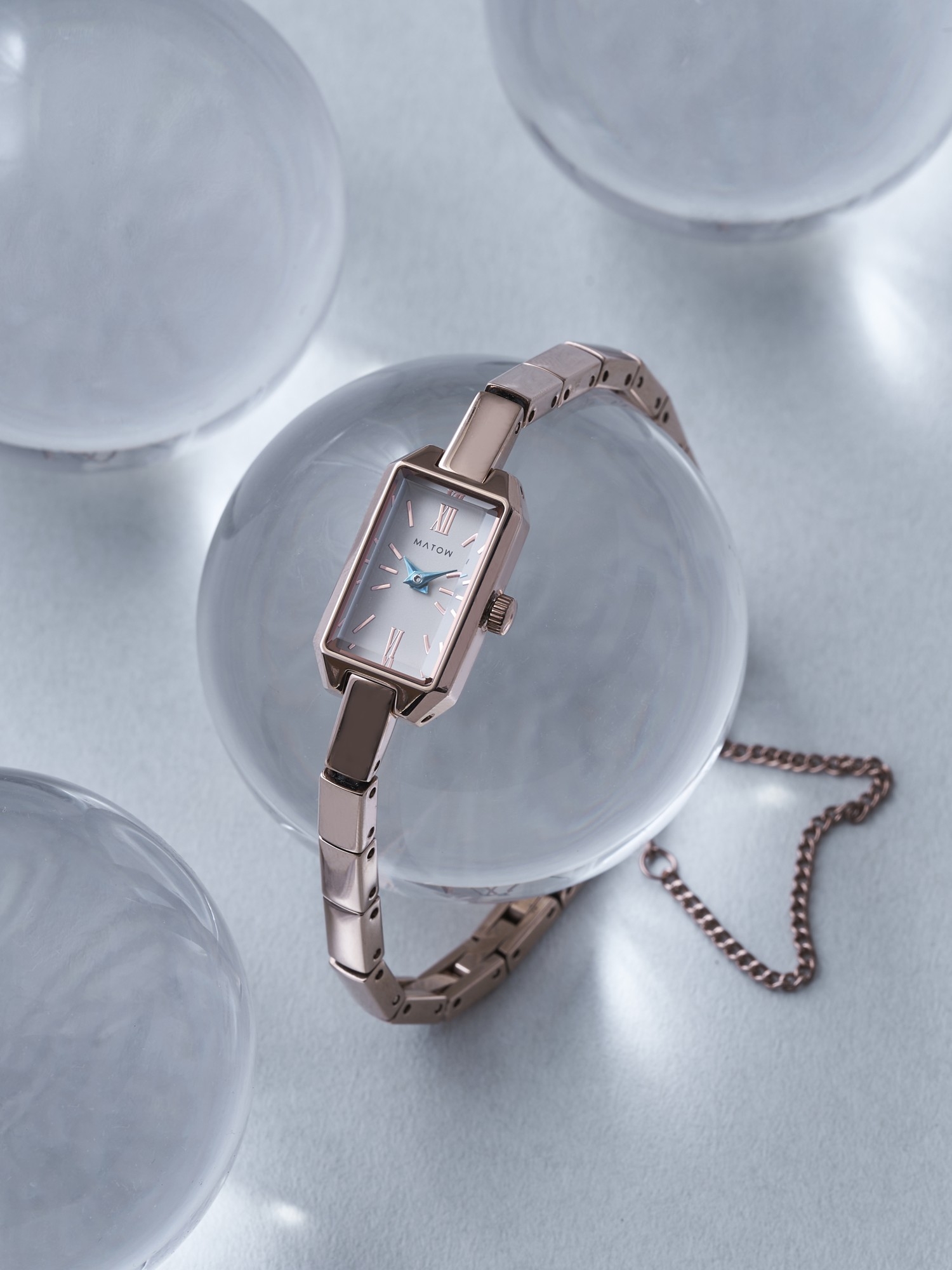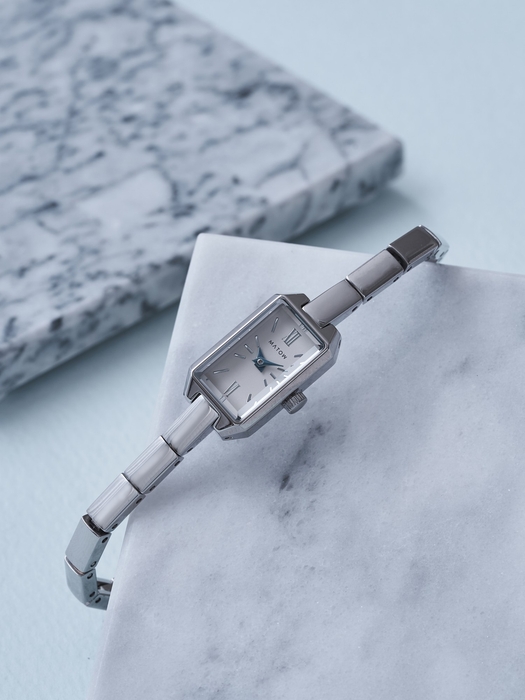 文字盤の繊細なインデックスは、月光が水面にそっと映るような柔らかな輝きを放ち、青針のアクセントが夜の静寂を思わせる深みを加えます。職人の手によって細部まで丁寧に仕上げられ、時代を超えて愛される一本となるように仕立てました。縦23mm×横13mmのコンパクトなレクタングルケースは、ローズゴールドとシルバーの2種類をラインナップ。それぞれケース同色のメタルベルトを備え、手首に馴染むように設計されています。さらに、バックル部分には細身のチェーンが付属し、ジュエリーのように楽しめる仕様に。シンプルながらも、手元に洗練された輝きを添えるデザインとなっています。
