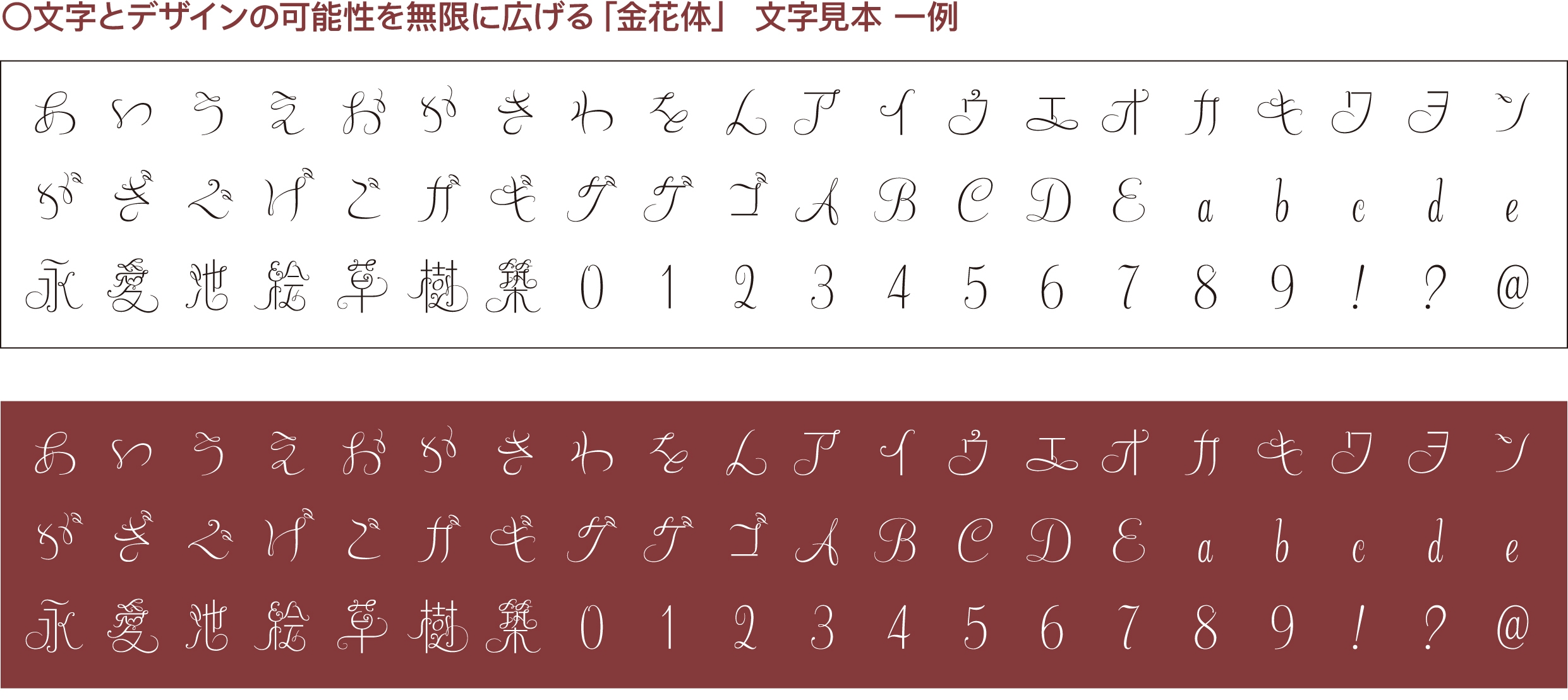 「金花体」の特長である一筆書きのように文字を続けて書く手書き文字の筆記体は、これまで欧文特有のデザインということもあり、漢字や仮名のデザインに取り入れる試みは正に革新的といえるでしょう。