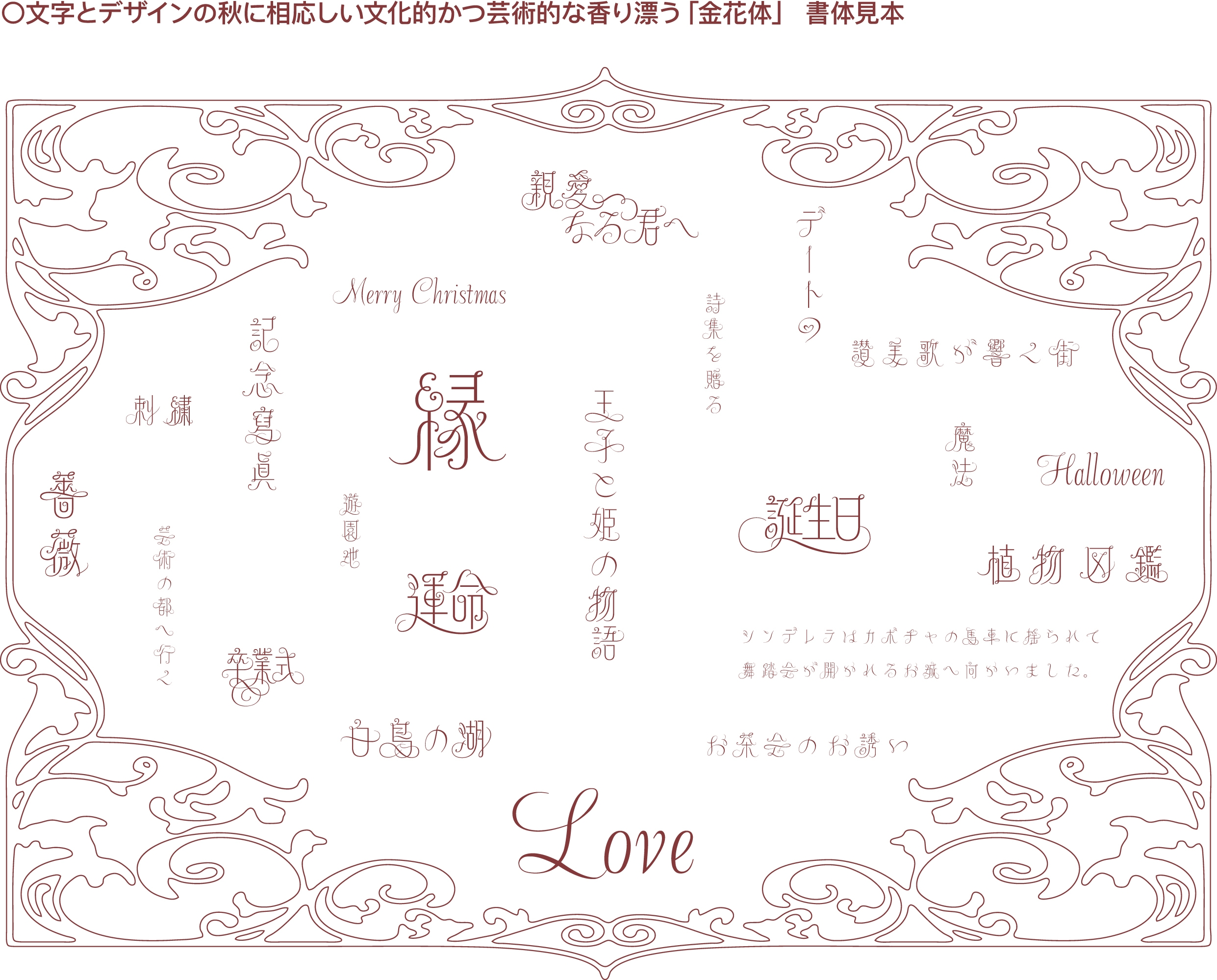 さらに「金花体」には、カリグラフィーのエレメントから作成した装飾を文字セットから選んで自由に組み合わせることが可能になるなど、これまで類を見ない稀有な書体になっています。