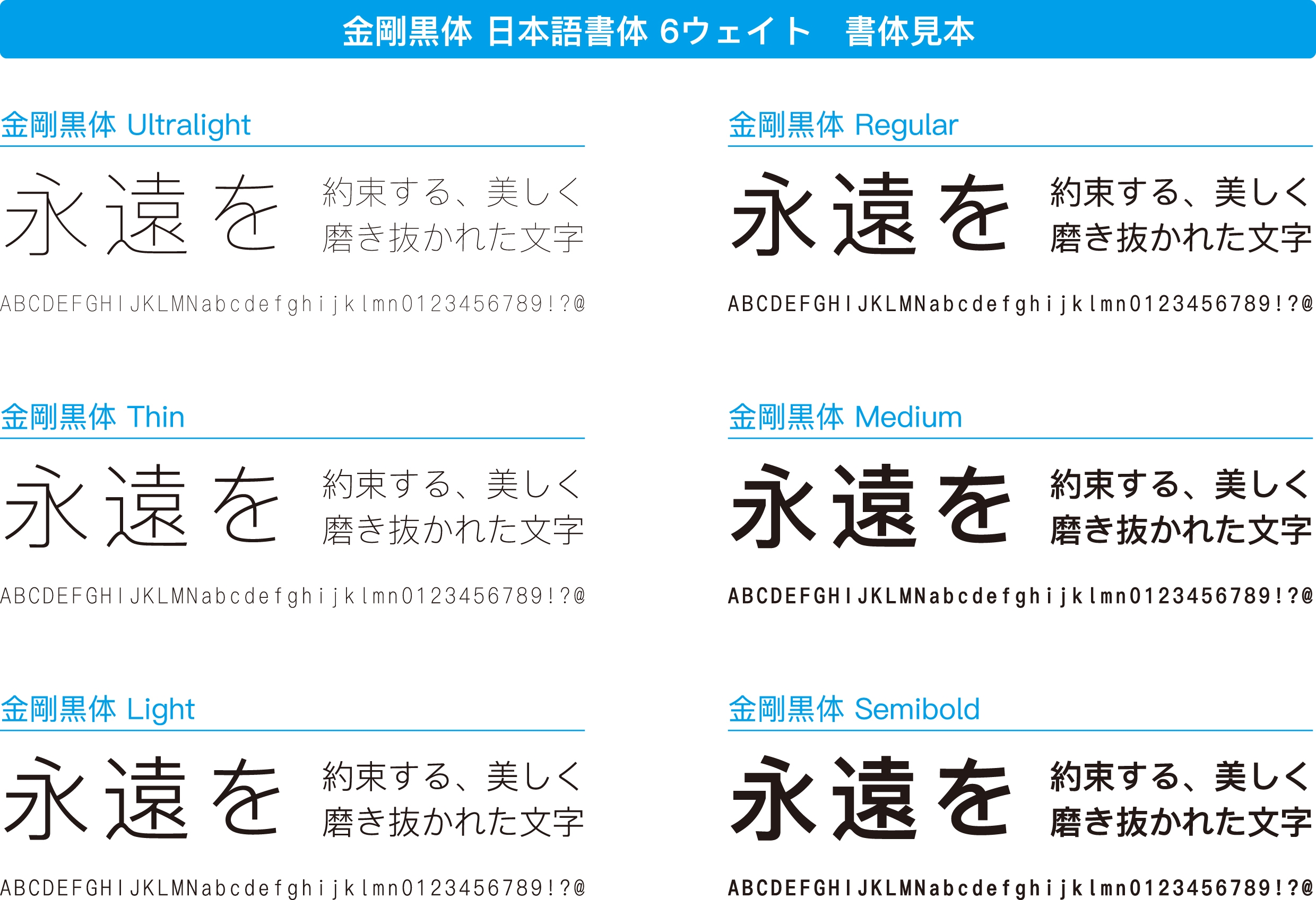 「金剛黒体」は、ダイヤモンドの王様と呼ばれるカーボネードのように光輝いた新しいスタイルのUltralight、Thin、Light、Regular、Medium、Semiboldの6ウェイトで展開するゴシック体ファミリーです。