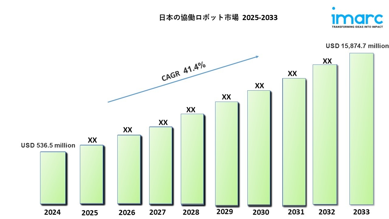 IMARCグループの最新の調査出版物「日本の協働ロボット市場レポート:コンポーネント(ハードウェア、ソフトウェア)、ペイロード(最大5kg、5~10kg、10kg超)、アプリケーション(マテリアルハンドリング、ピックアンドプレース、組立、パレタイジング/デパレタイジング、その他)、最終用途産業(自動車、エレクトロニクス、製造、食品・飲料、化学・製薬、その他)、地域別2025~2033年」によると、日本の協働ロボット(コボット)市場規模は2024年に5億3,650万米ドルに達しました。今後、IMARCグループは、市場規模が2033年までに158億7,470万米ドルに達し、2025~2033年の間に41.4%の成長率(CAGR)を示すと予測しています。