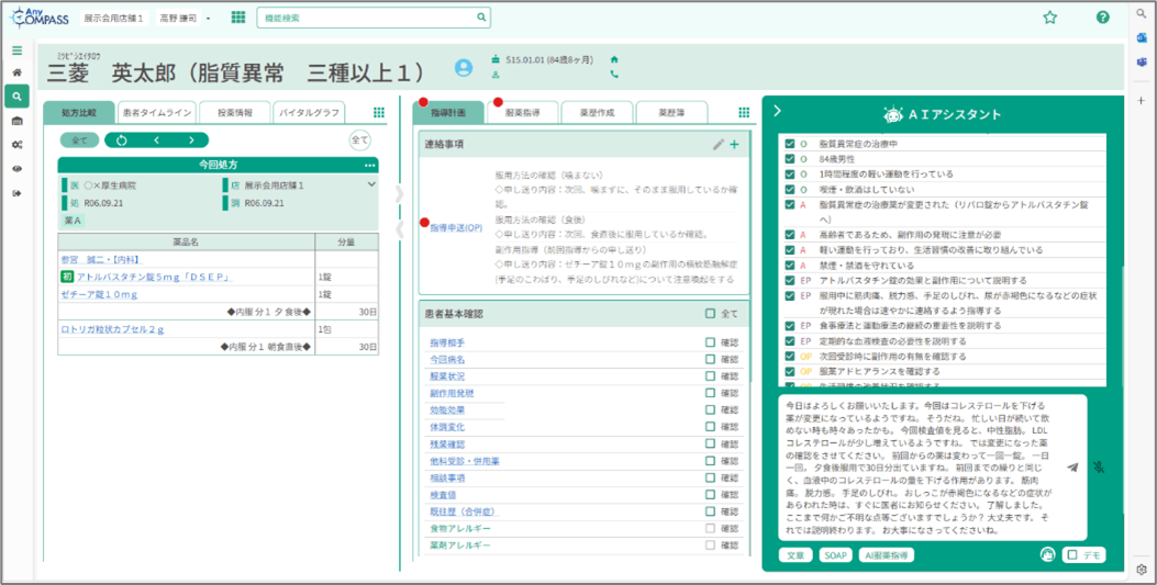 生成AIを活用する事で、AIアシスタントが「AnyCOMPASS」の有する指導内容データベース及び、過去の指導実績から今回処方箋の情報と照らし合わせ、患者にあった指導内容をアドバイスします。また、患者属性情報・患者基本確認情報・処方内容、及び患者と薬剤師との会話情報から、AIアシスタントがSOAP形式の薬歴を自動生成する事により、薬歴記載業務を効率化します。