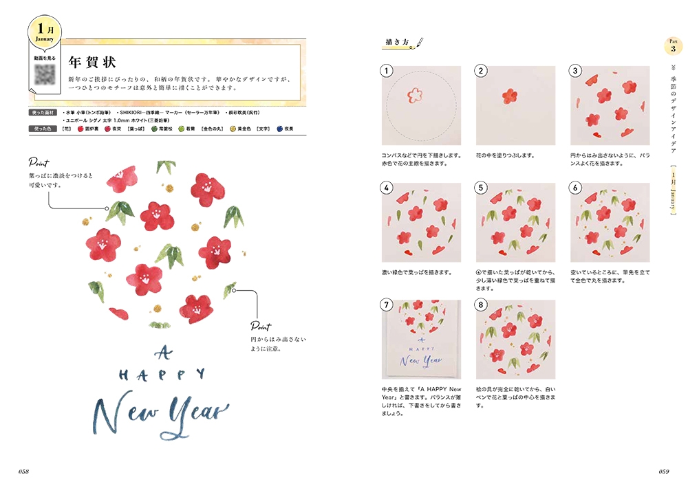 水彩の基本テクニックから始まり、筆のストローク、アルファベットの書き方、簡単な葉っぱや花の描き方をやさしく解説します。後半では、1月~12月まで月ごとに、季節の花やモチーフの素敵なデザイン作例をたっぷり紹介します。