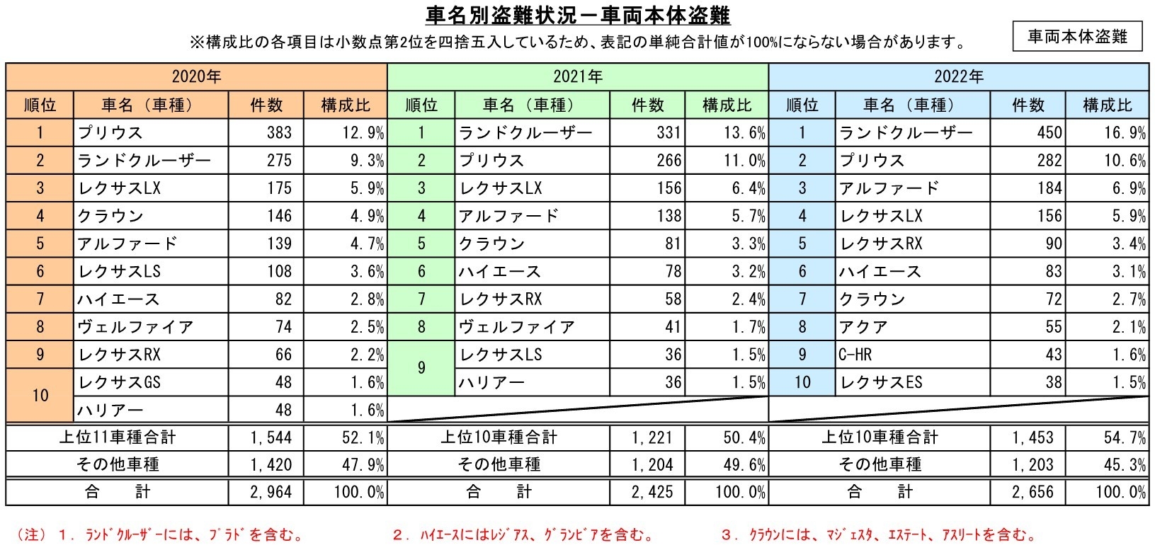 ・プリウスは2020年にワースト1、2021年、2022年にはワースト2となるなど、車両本体盗難の被害が特定の車種に集中する傾向が続いています。