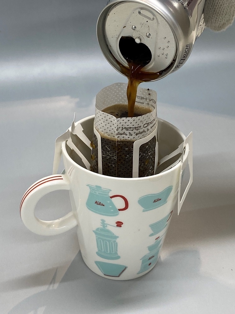 ドリップ用に粉砕されているコーヒー豆を、メスティンなどで 好みの色に焙煎し、お湯を加え、付属のフィルターに注ぐだけの新発想コーヒー