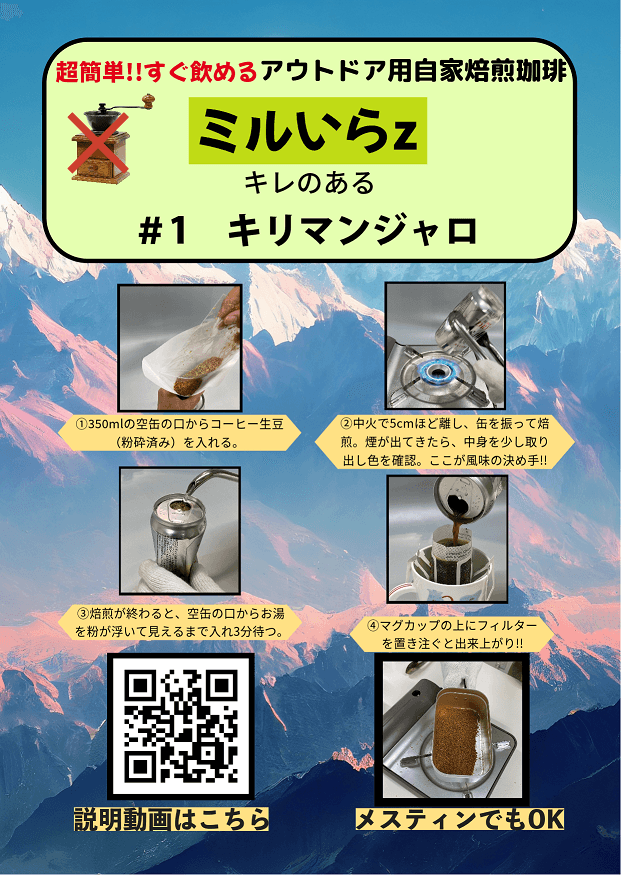 今回開発した「ミルいらz」は、その課題を解決するため、生豆の水分値を半分にしてから粉砕していますので、キャンプ道具の必需品であるメスティンや空き缶など、そこにあるもので焙煎し、お湯を入れ、同梱のフィルターでろ過するだけというシンプルなプロセスで、楽しく美味しいコーヒーをアウトドアでも楽しむことができます。