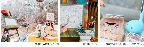 SIKIドームを11:00から16:00まで1日2組限定で貸切利用できます。ドーム内からフラワーシーズンの「SIKIガーデン~音の散策路~」の風景を眺めたり、備え付けのオルゴールやカリンバ、オタマトーンなどの楽器の演奏体験やボードゲームや本を楽しんだりと、思い思いののんびりした時間が過ごせます。当プランでは、芸術家の憩いの場をイメージし、インテリアや塗り絵なども設えています。