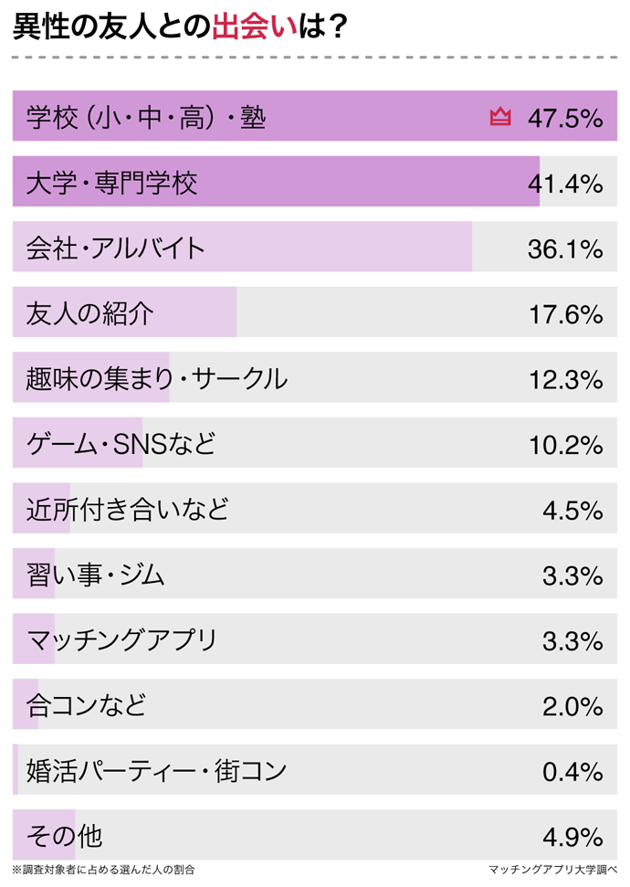 出会いのきっかけは「学校 (小・中・高)・塾」と答えた人が47.5%で最多数。青春時代に性別を越えた交友関係を持った人が、5割近くに及びました。