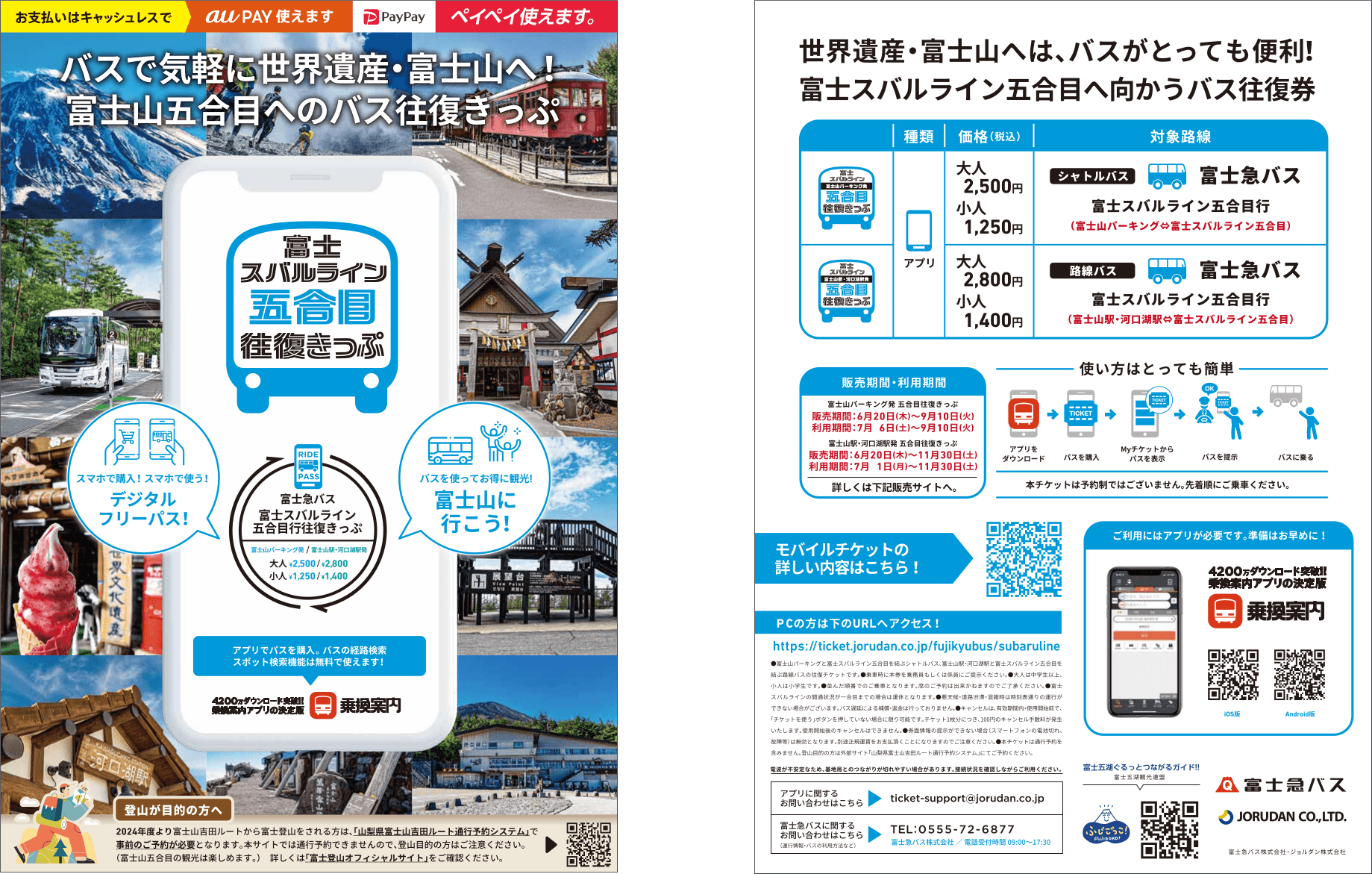 ジョルダン株式会社(本社:東京都新宿区、代表取締役社長:佐藤 俊和、以下「ジョルダン」)は、6月20日(木)から期間限定で、富士急バス株式会社(本社:山梨県南都留郡富士河口湖町、代表取締役:古屋 毅、以下「富士急バス」)が企画・運行する「富士スバルライン五合目往復きっぷ」を、昨年に引き続きモバイルチケットで販売開始します。