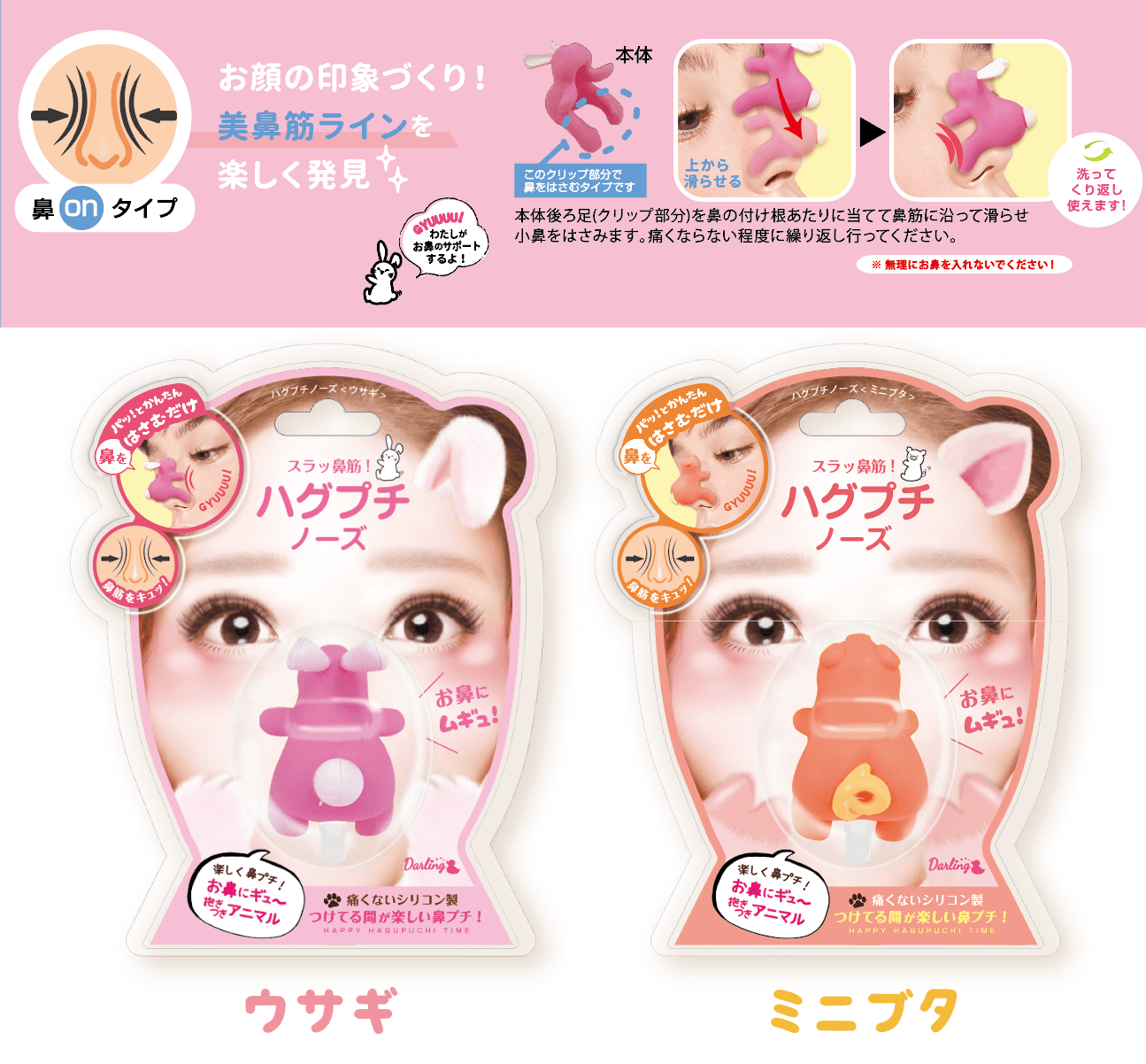 鼻の中にいれて鼻をツンっと見せる「パンダ」「ベア」、鼻に被せて鼻筋をスラッと小鼻に見せる「ウサギ」「ミニブタ」の4種類の動物が、まるでお鼻に抱きついちゃったように見える、かわいくてついつい笑っちゃうおもしろグッズです。