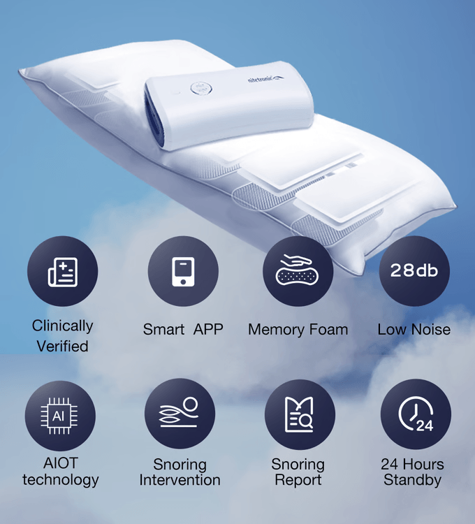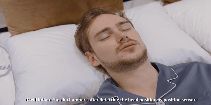 多くの場合、いびきは寝ている間に気道が狭まることにより発生します。Z6マクラはいびきが始まると、独自の集音センサーで素早く感知し、頭の位置を検出します。そして効果的に気道が広がる頭の位置を算出し、内蔵された6つのエアバッグに空気を送ることで位置を修正、気道を確保します。いびきが発生するたびにすぐにこれを繰り返し、いびき軽減・防止につなげます。