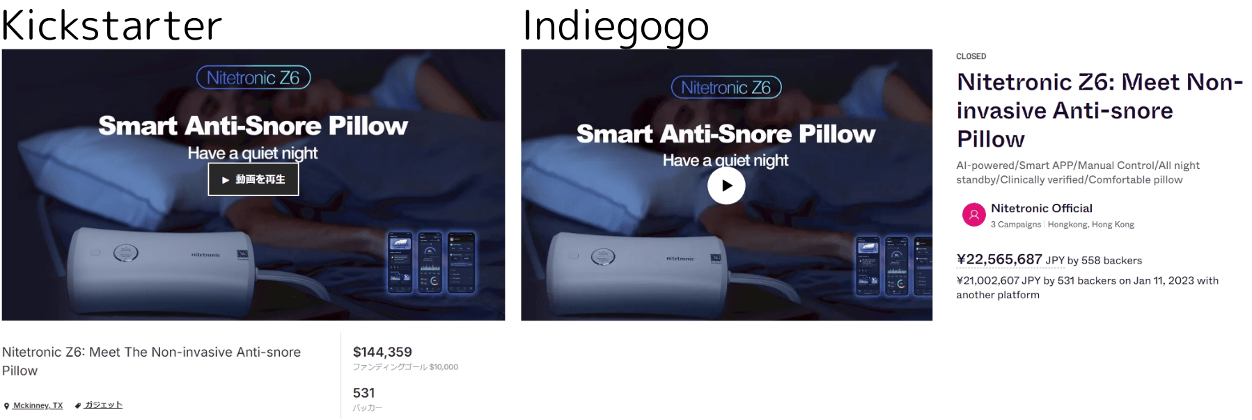 Z6マクラは先行で行われた海外大手クラウドファンディングサイト(Kickstarter、Indiegogo)で合計4,000万円以上の支援額を得て、その後もアメリカをメインに月間500個以上のセールスがある「世界に認められたいびき改善マクラ」です。