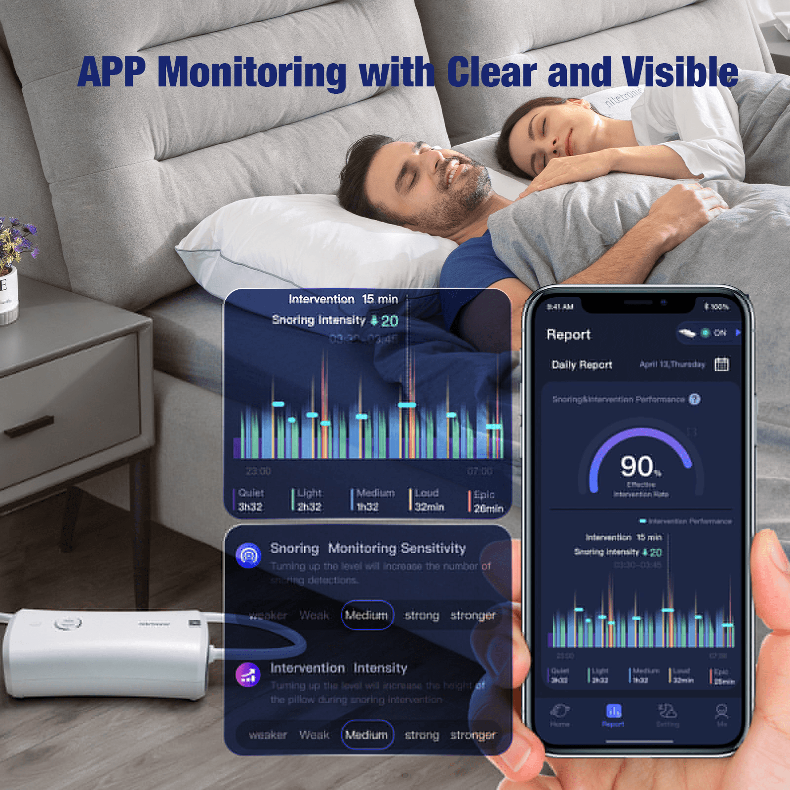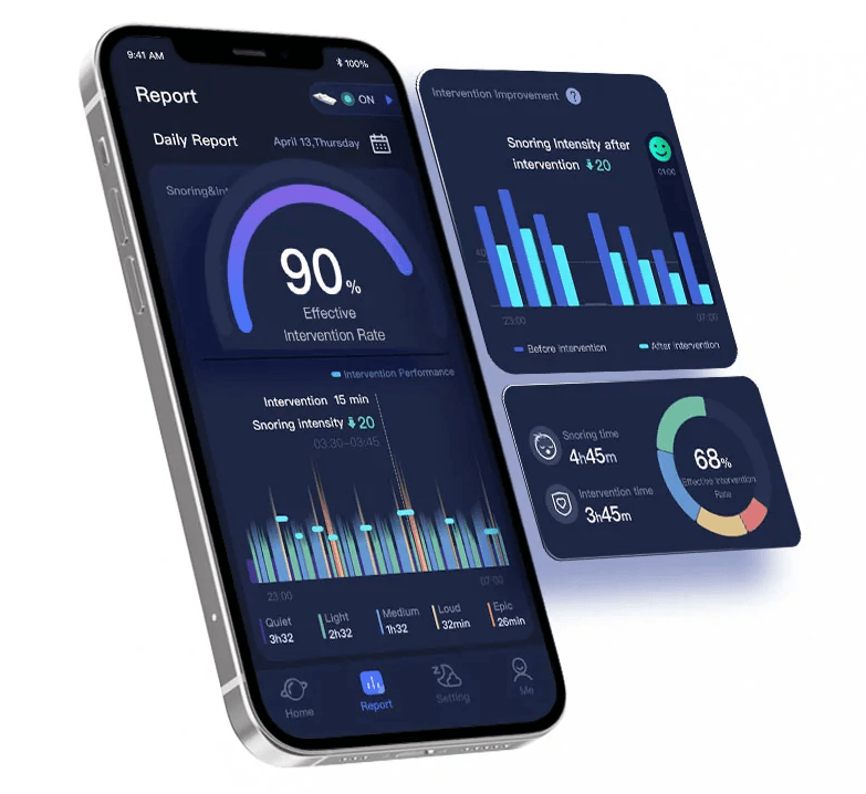 専用アプリで日々のいびき軽減状況を数値やグラフで実感できます。遠く離れた方のいびき改善効果を確認することも可能です(アプリを接続しなくてもご使用いただけます)。