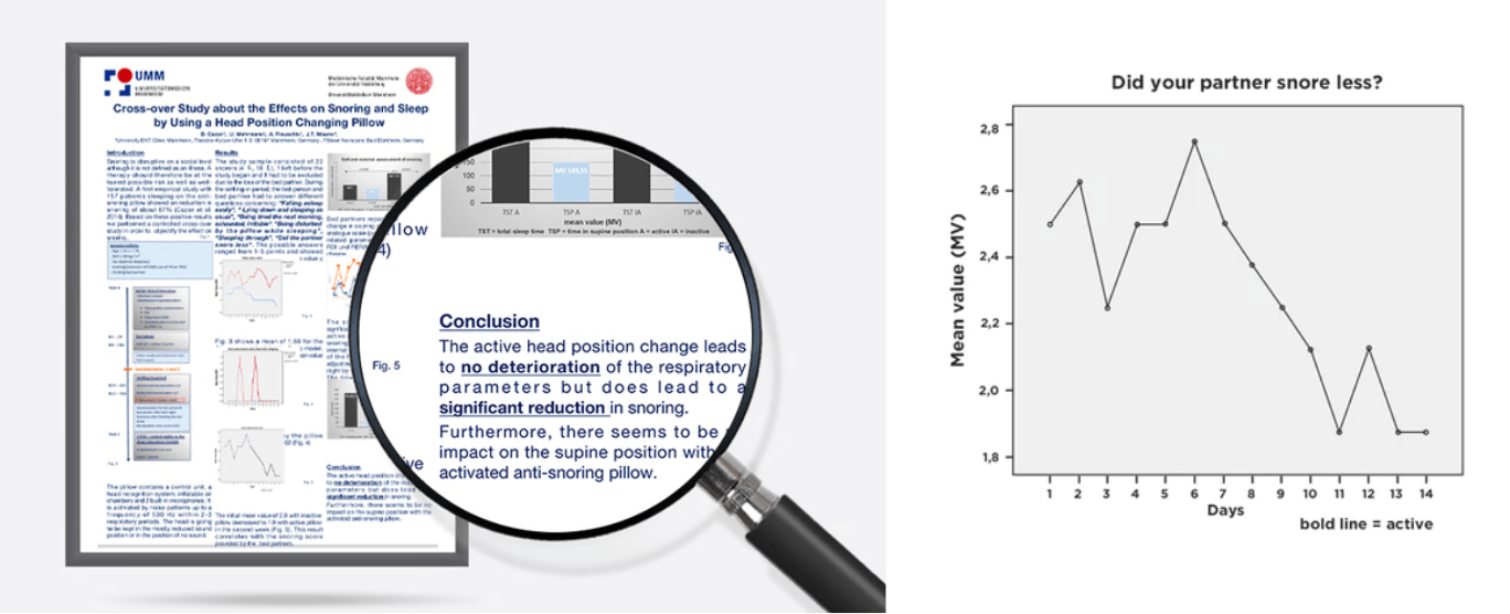 年間23万人の患者を治療している、ドイツマンハイム大学病院と、“ドイツのハーバード”と言われるハイデルベルク大学の医学部が、共同臨床研究で“被験者の約7割に、いびきの軽減・消滅が認められた”、“同室のパートナーが、いびきによる騒音が減っていることを報告”と実証しました。