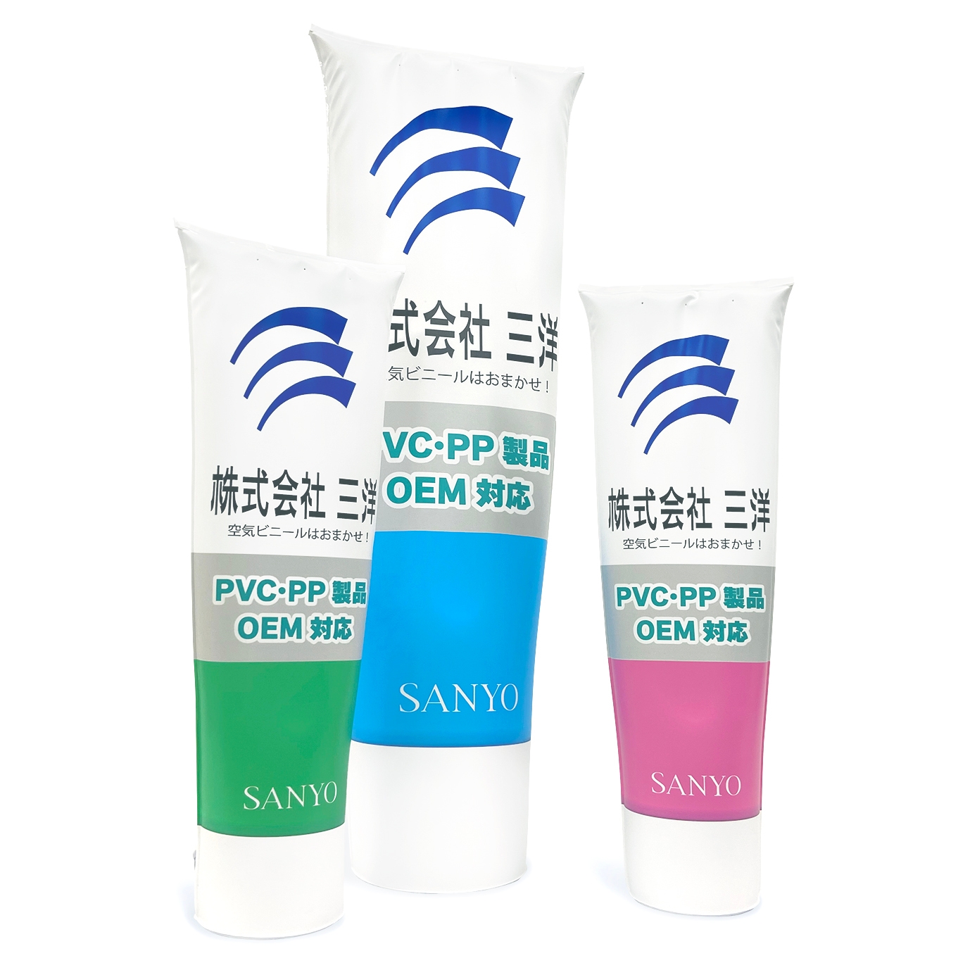 販促用の空気入りビニールは店頭POPとして利用されることが多く、その中でも「ダミーPOP」は商品を模して制作されます。様々な形やサイズに対応することができ、商品そのままの見た目で大きく制作することが可能なので、商品の形状を印象に残しやすい特徴があります。軽量のため、高いところに吊るすことが可能で、店内でも売り場が遠くからでもわかりやすくなるため主に食品業界に人気です。また乗物など大きなものを小さなPOPにする事例もあります。