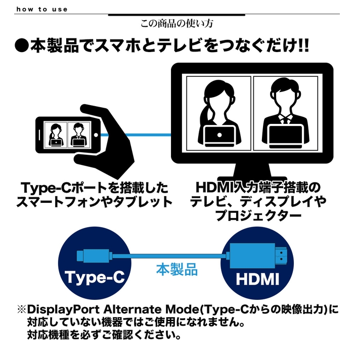 Type-Cポートを搭載した機器の映像信号を変換し、HDMI入力端子を搭載したテレビ・ディスプレイ・プロジェクターに出力することができます。